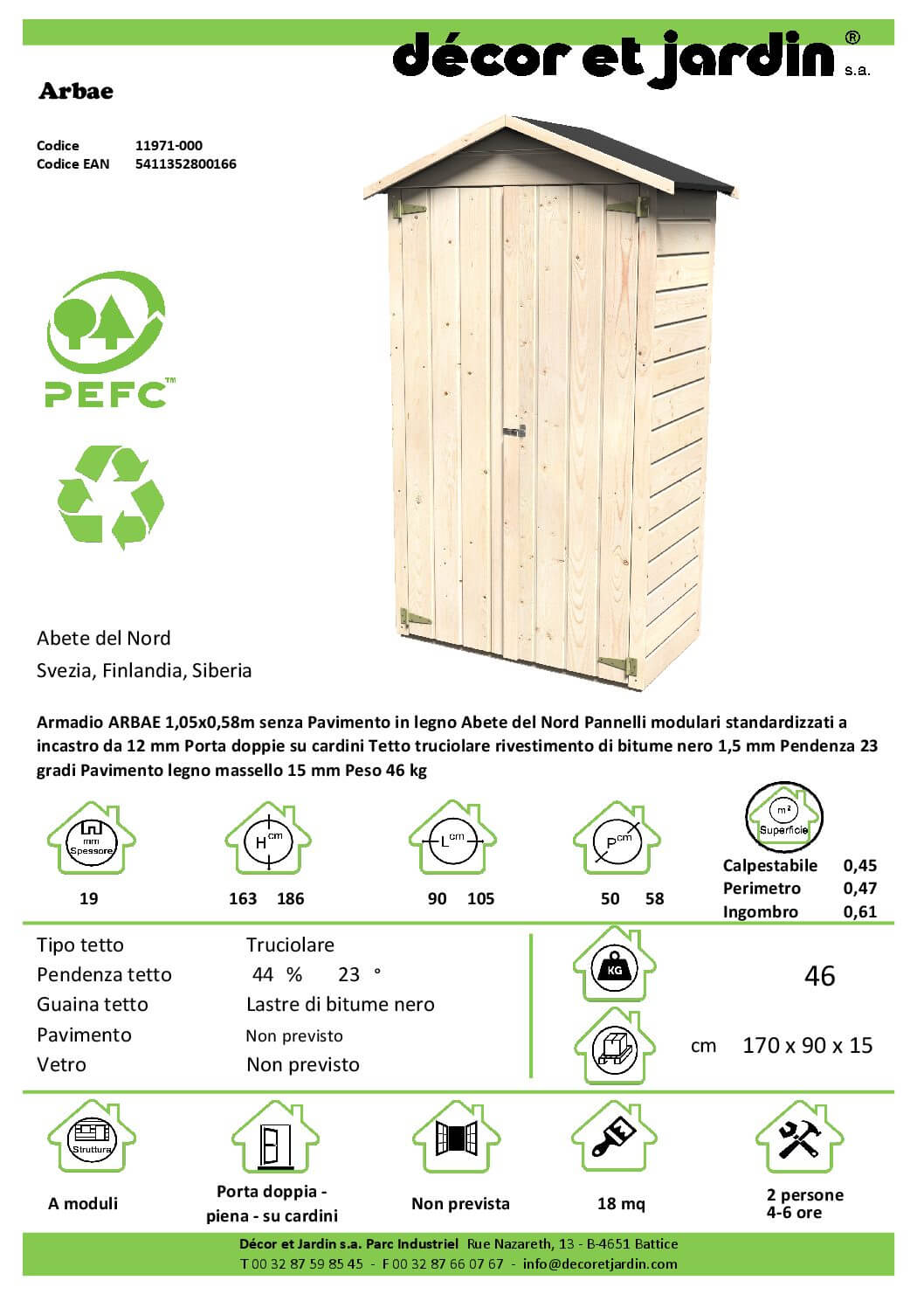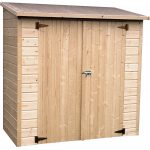 Armadio ARBAE 1,05×0,58m in legno Abete del Nord Pannelli modulari standardizzati a incastro da 12 mm Porta doppie su cardini Tetto truciolare rivestimento di bitume nero 1,5 mm Pendenza 23 gradi Pavimento legno massello 15 mm Peso 46 kg
