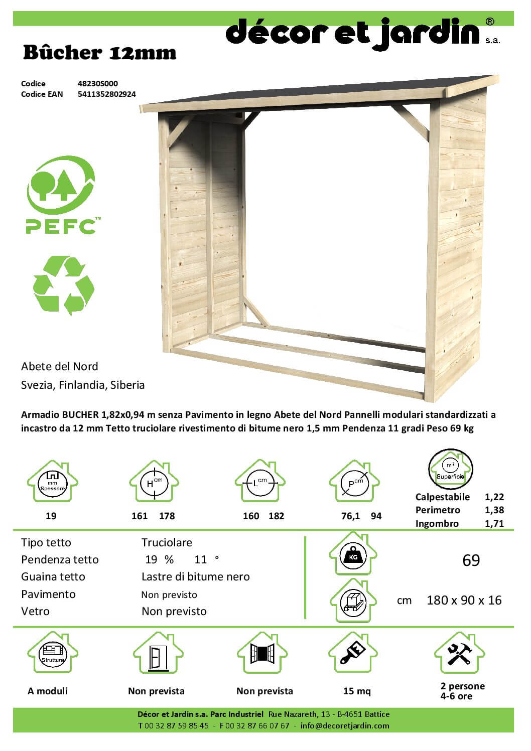 Armadio BUCHER 1,82×0,94 m senza Pavimento in legno Abete del Nord Pannelli modulari standardizzati a incastro da 12 mm Tetto truciolare rivestimento di bitume nero 1,5 mm Pendenza 11 gradi Peso 69 kg