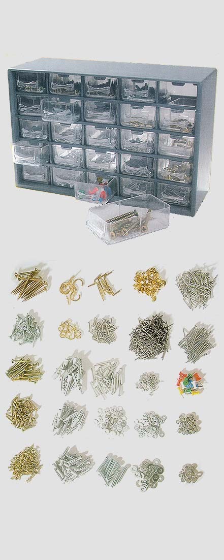 N.1000 Pezzi Assortiti Di: Viti, Dadi, Rondelle, Chiodi, Tasselli, Ganci, Puntine – Con Portaminuterie 25 Posti Dim.cm.27x18x10