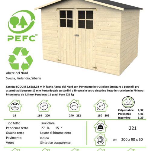 Casetta AMBEAL 1,49×1,82 m in legno Abete del Nord con Pavimento in truciolare Struttura a pannelli pre assemblati Spessore 12 mm Porta singola Tetto in truciolare con Finitura bituminosa da 1,5 mm Pendenza 36 gradi Peso 132 kg