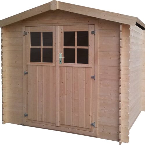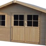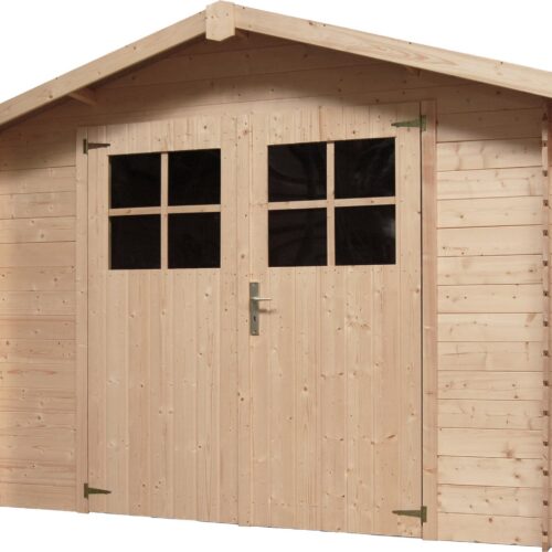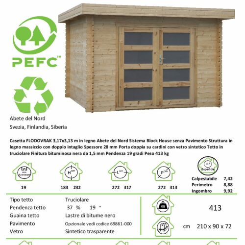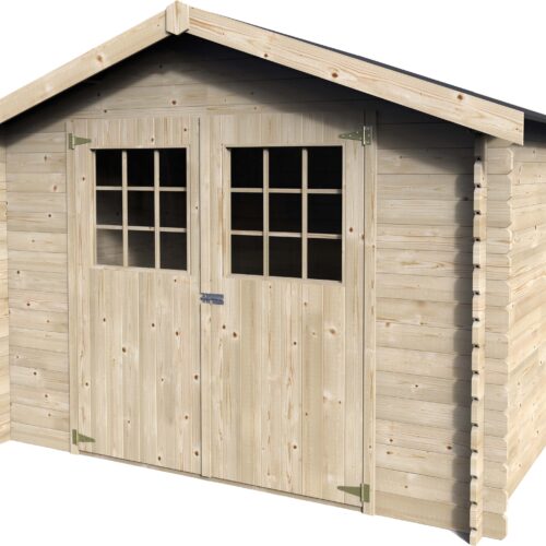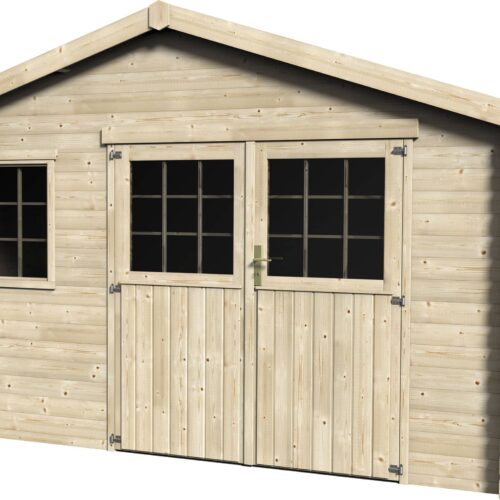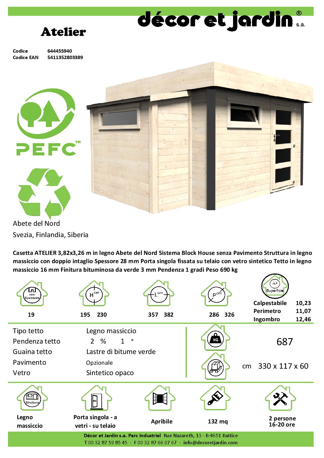 Casetta ATELIER 3,82×3,26 m in legno Abete del Nord Sistema Block House senza Pavimento Struttura in legno massiccio con doppio intaglio Spessore 28 mm Porta singola fissata su telaio con vetro sintetico Tetto in legno massiccio 16 mm Finitura bituminosa da verde 3 mm Pendenza 1 gradi Peso 690 kg