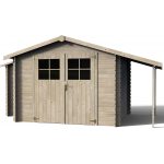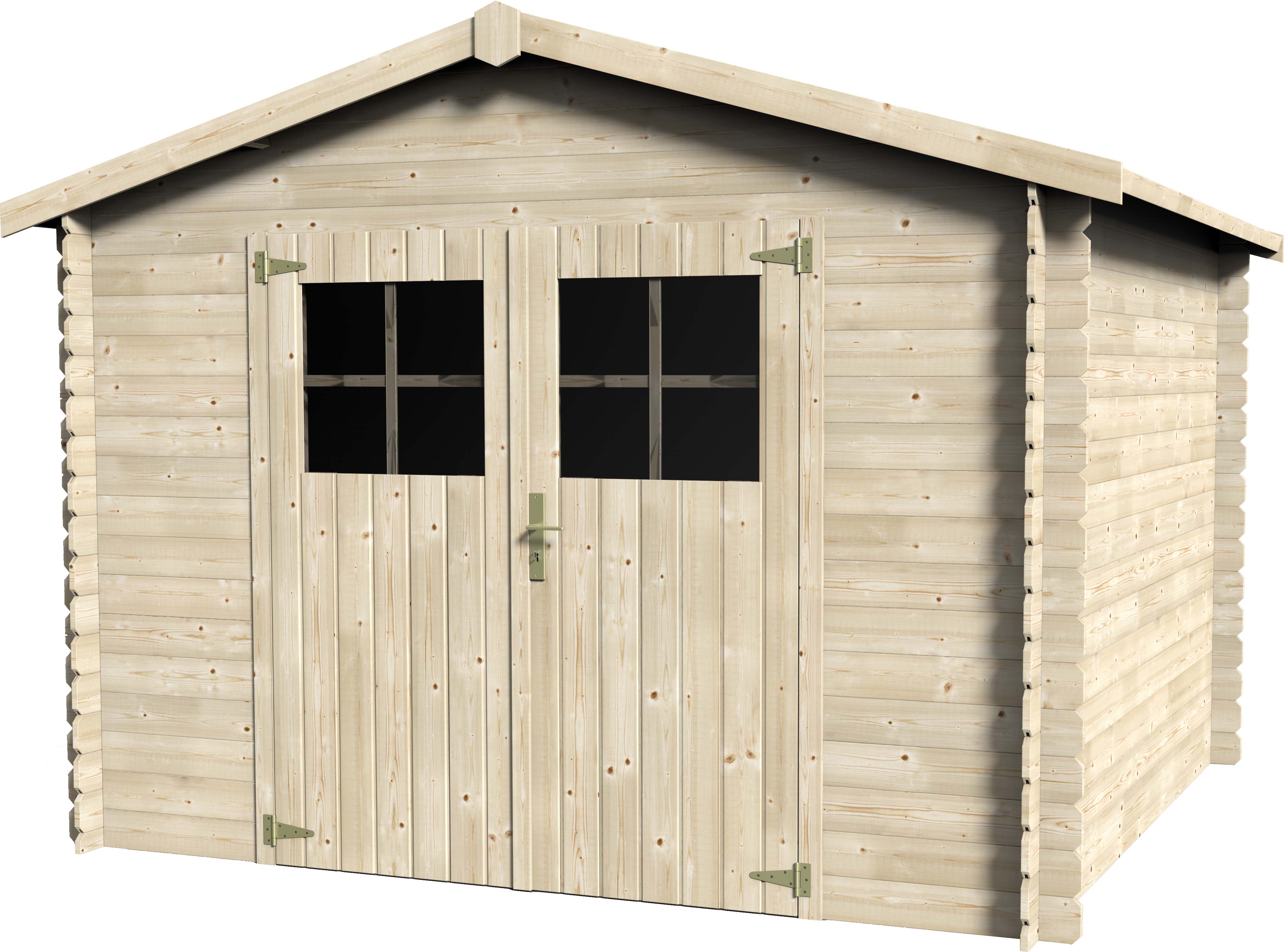 Casetta CHECY 3,08×2,73 m in legno Abete del Nord Sistema Block House senza Pavimento Struttura in legno massiccio con doppio intaglio Spessore 19 mm Porta doppia con vetro sintetico Tetto in legno massiccio 16 mm Finitura bituminosa da 1,5 mm Pendenza 16 gradi Peso 328 kg