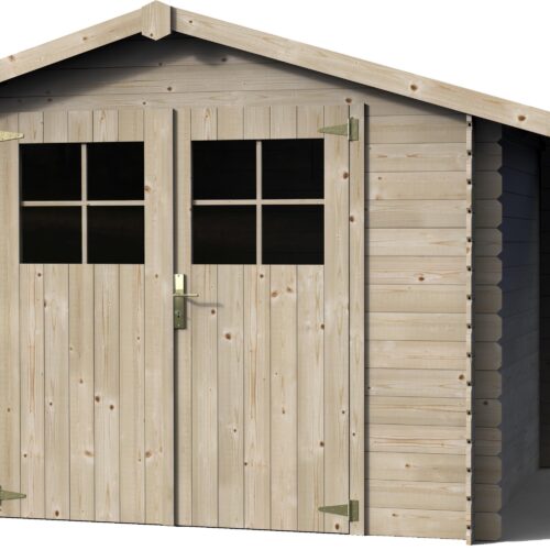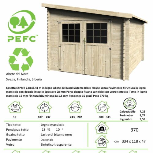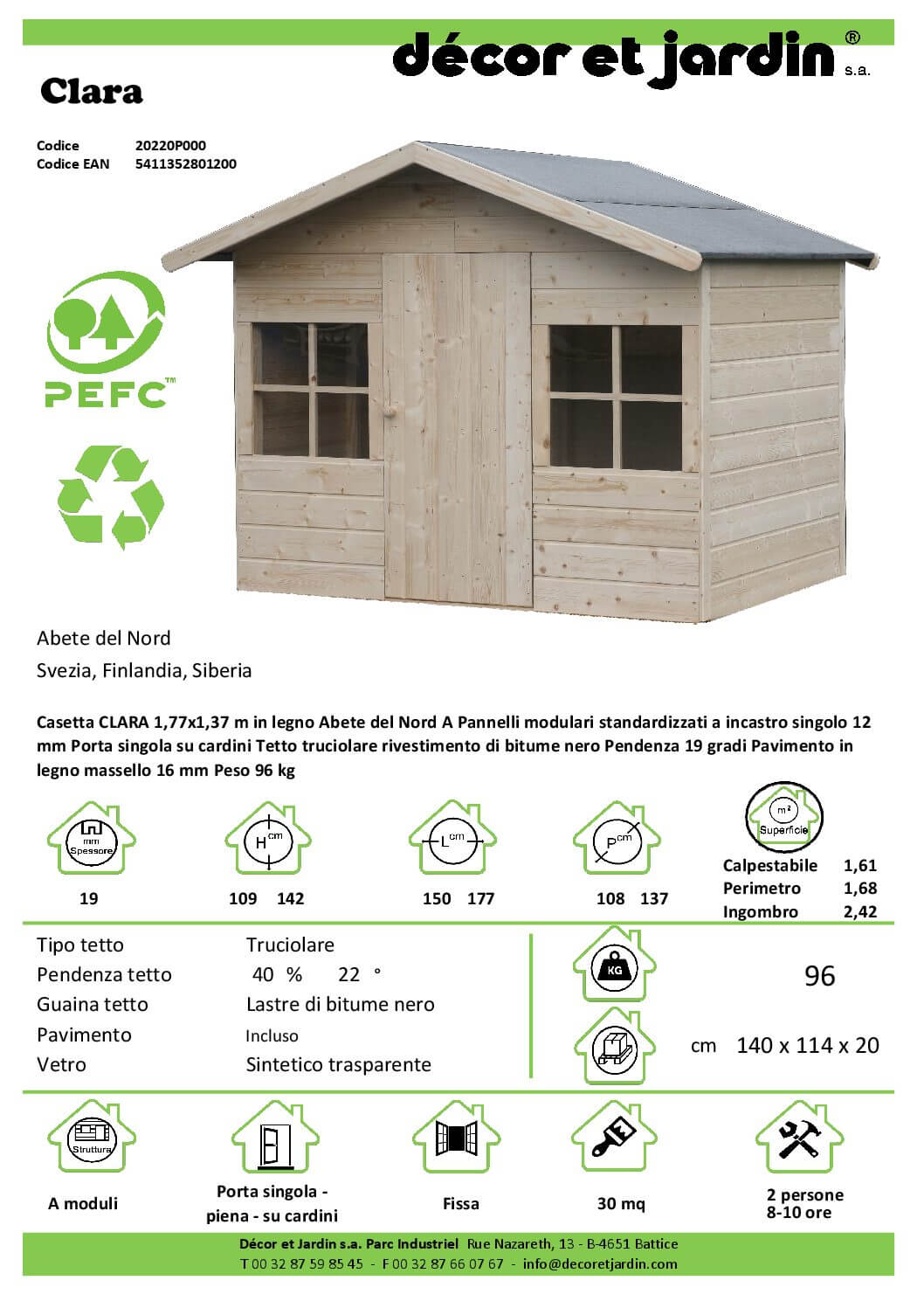 Casetta CLARA 1,77×1,37 m in legno Abete del Nord Pavimento Pannelli modulari standardizzati a incastro singolo 12 mm Porta singola su cardini Tetto truciolare rivestimento di bitume nero Pendenza 19 gradi Pavimento in legno massello 16 mm Peso 96 kg