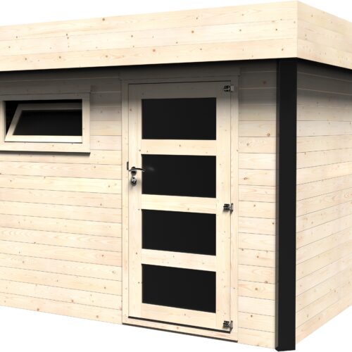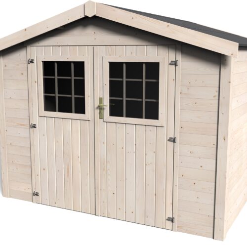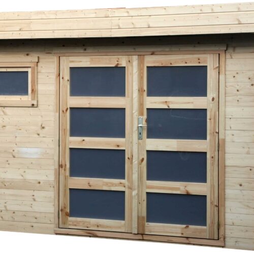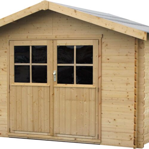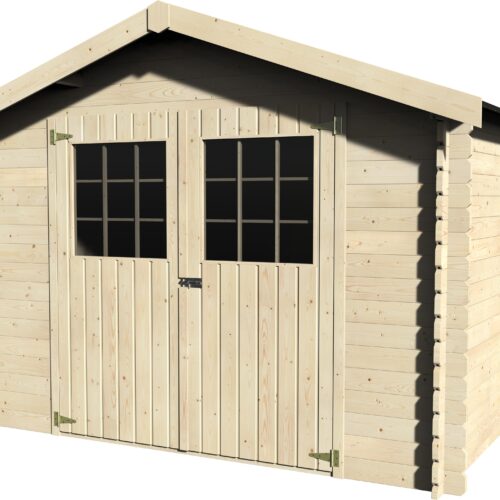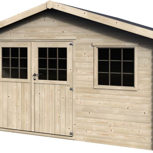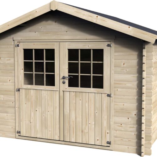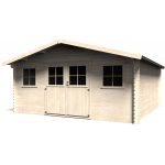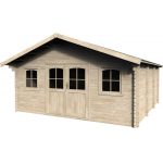Casetta VALFOR 4,27×4,15 m in legno Abete del Nord Sistema Block House senza Pavimento Struttura in legno massiccio con doppio intaglio Spessore 34 mm Porta doppia fissata su telaio con vetro sintetico Tetto in legno massiccio 16 mm Finitura bituminosa nera da 1,5 mm Pendenza 18 gradi Peso 815 kg