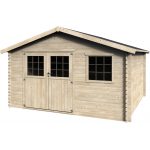 Casetta VALOGRAN 5,17×4,34 m in legno Abete del Nord Sistema Block House senza Pavimento Struttura in legno massiccio con doppio intaglio Spessore 34 mm Porta doppia fissata su telaio con vetro sintetico Tetto in legno massiccio16 mm Finitura bituminosa da verde 3 mm Pendenza 19 gradi Peso 938 kg