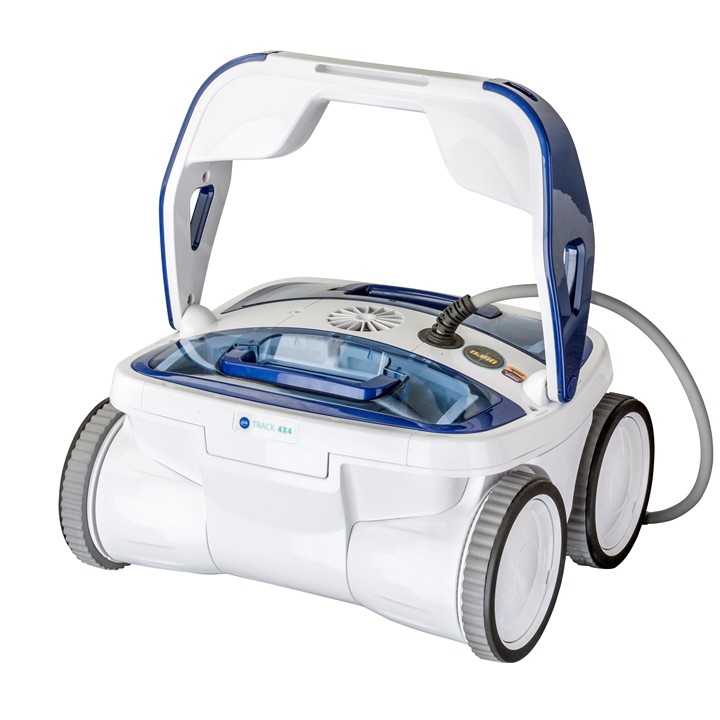 Il Robot Track 4×4 si adatta a tutti i tipi di piscina fino a 90 m2 di superficie, pulendo il fondo, le pareti e linea d’acqua.