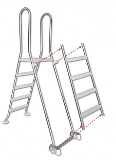 Scaletta di sicurezza con parte frontale estraibile. Struttura e viteria in acciaio inox. 4+4 scalini, piattaforma e blocchi di sicurezza. Per piscine con bordo massimo 135 cm.