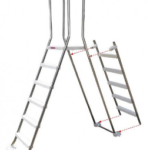 Scaletta di sicurezza con parte frontale estraibile. Struttura e viteria in acciaio inox. 4+4 scalini, piattaforma e blocchi di sicurezza. Per piscine con bordo massimo 135 cm.
