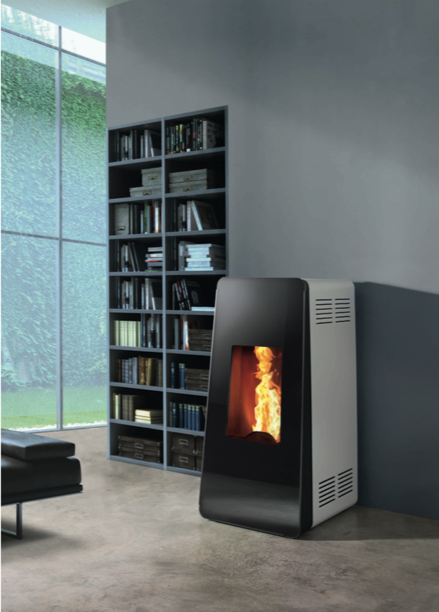 Stufa d’ispirazione moderna, un perfetto connubio tra estetica e funzionalità, risponde alle esigenze del più evoluto interior design. Il frontale, caratterizzato da angoli arrotondati, mette in risalto la porta con un vetro di ampie dimensioni ed esalta la visione del fuoco. Rivestimento in lamiera d’acciaio verniciata. Struttura in acciaio verniciato nero.