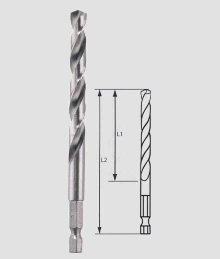 Punta Elicoidale Con Codolo Esagonale Da 1/4″ Din 3126-e6.3 In Acciaio Rapido Din 338 – Destrorsa Di Tipo N, – Punta Perforante A 135deg;, Affilatura Incrociata Din 1412 C, Tolleranza Di Ø H 8.