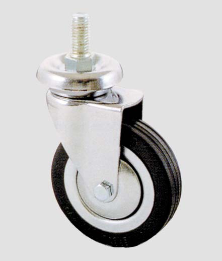 Supporto In Acciaio Cromato Stampato Rotante Su Doppia Corona Di Sfere – Ruota In Gomma Nera Con Parafili E Flange In Acciaio Stampato, Rotante Su Cuscinetti A Sfera