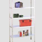 Montaggio A Bulloni – In Lamiera D’acciaio Pressopiegato Verniciato Colore Grigio – 8 Angolari Cm.95 – 5 Ripiani – Piedini In Plastica